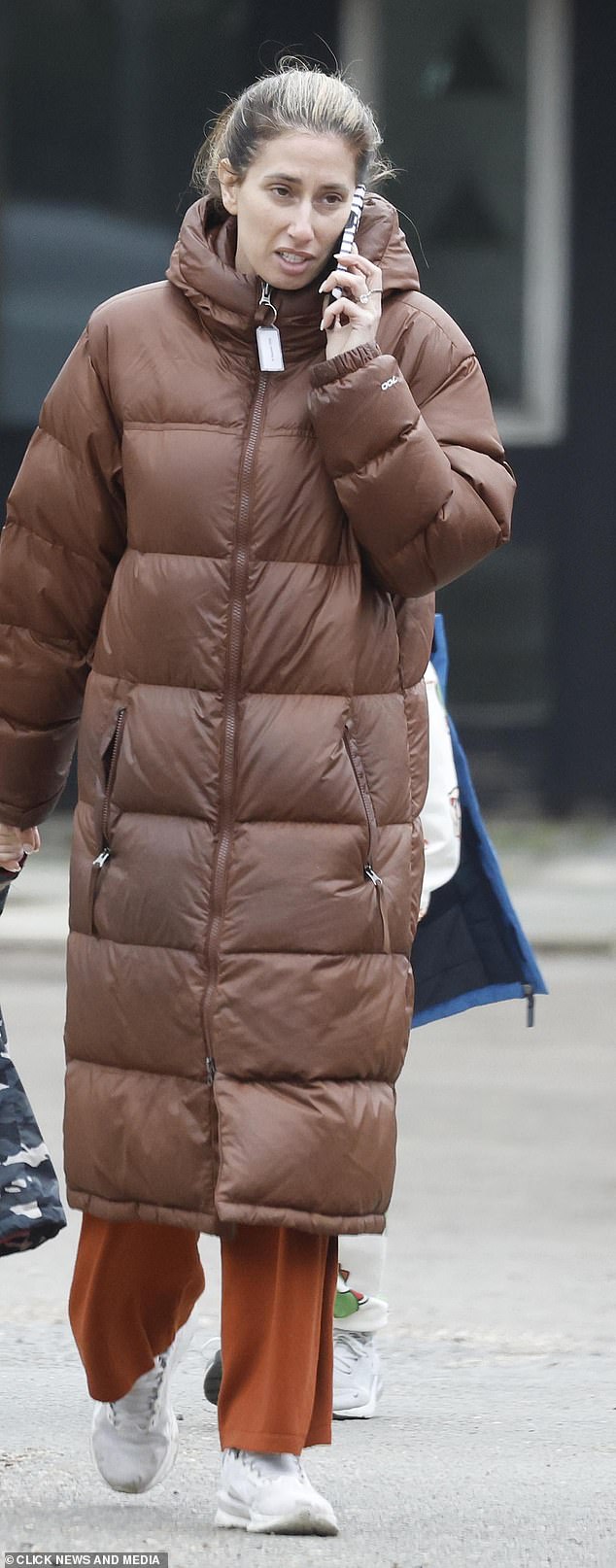 The Sort Your Life Out presenter wrapped up in a brown padded jacket as she kept it casual in a pair of rust coloured joggers and white trainers
