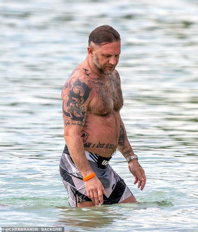 Tom Hardy showcased his array of body ink as he kicked back on the beach with his wife Charlotte Riley on a family holiday in Barbados on Wednesday.