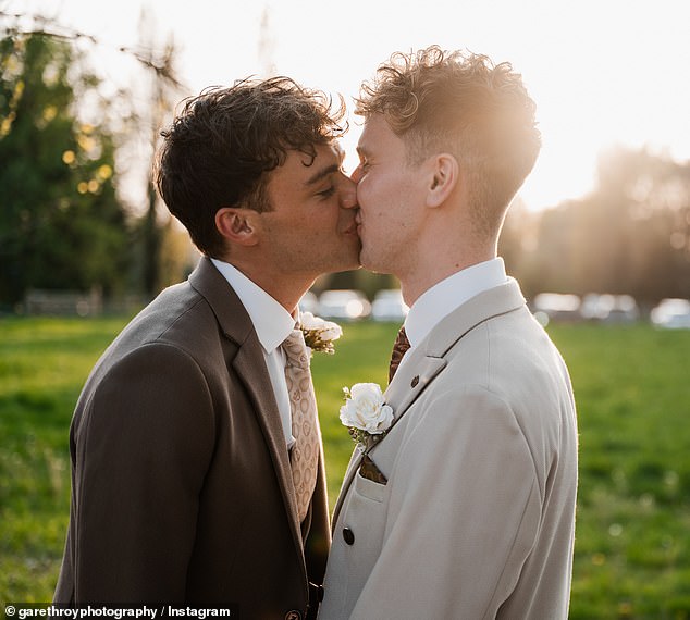 Emmerdale star Bradley Riches (L) tied the knot with artist fiancé Scott Johnson (R) in an intimate ceremony in Maidenhead on Wednesday (Pictured last year)