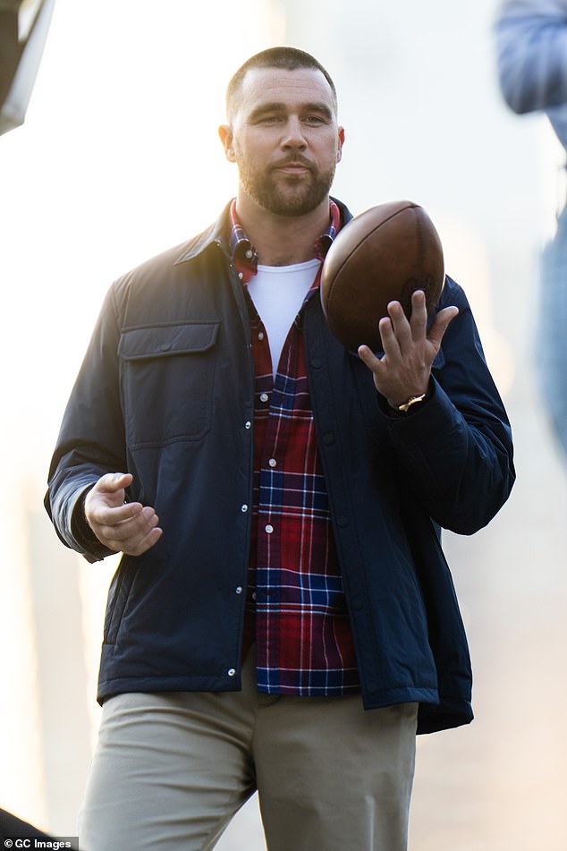 Taylor Swift, 36, supported fiancé Travis Kelce, 36, while he shot a new campaign for Tommy Hilfiger in New York City on Monday (pictured)