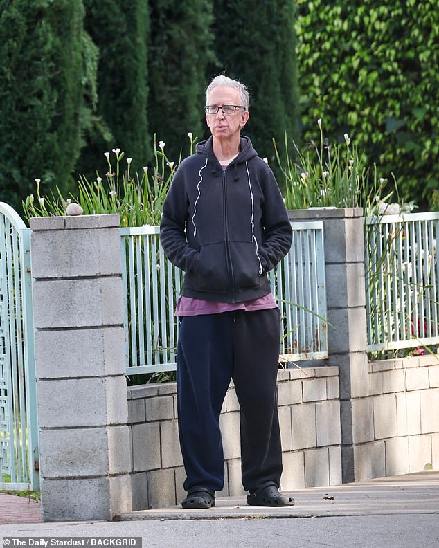 But the NewsRadio star looked untroubled as he stepped out this week in a black zip-up hoodie and matching sweatpants, along with a purple T-shirt and black Crocs.