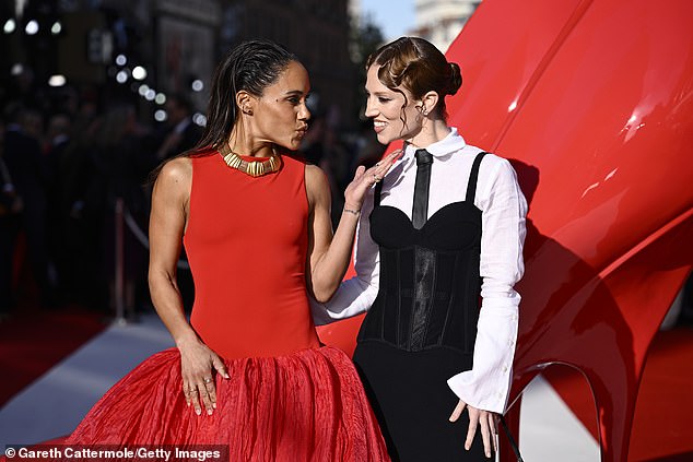 Presenter Alex, 41, caught the eye in a bold red sleeveless gown while singer Jess, 36, cut a trendy figure in a black corset gown which she layered over a smart white shirt and black tie