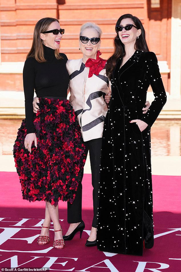 The Oscar-winning actress, 76, was in great spirits as she sandwiched herself between Emily Blunt and Anne Hathaway, who play Emily Charlton and Andy Sachs respectively.