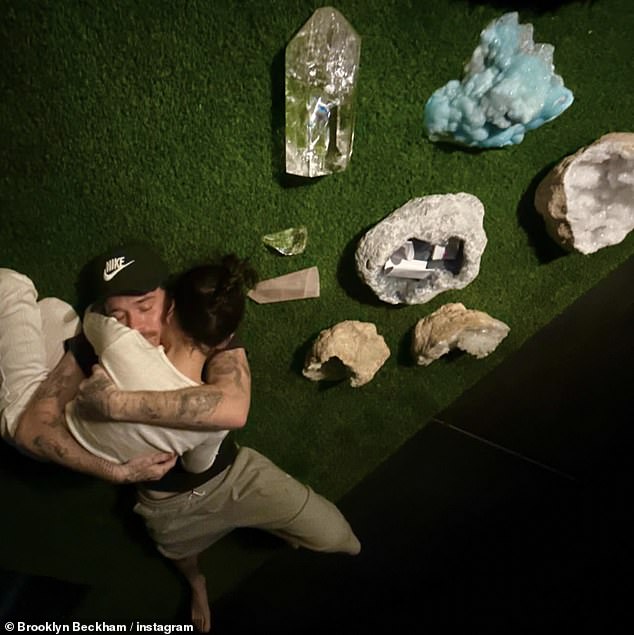 Brooklyn Beckham, 27, tightly embraced his wife Nicola Peltz, 31, during a crystal healing practice at their home in Los Angeles on Saturday