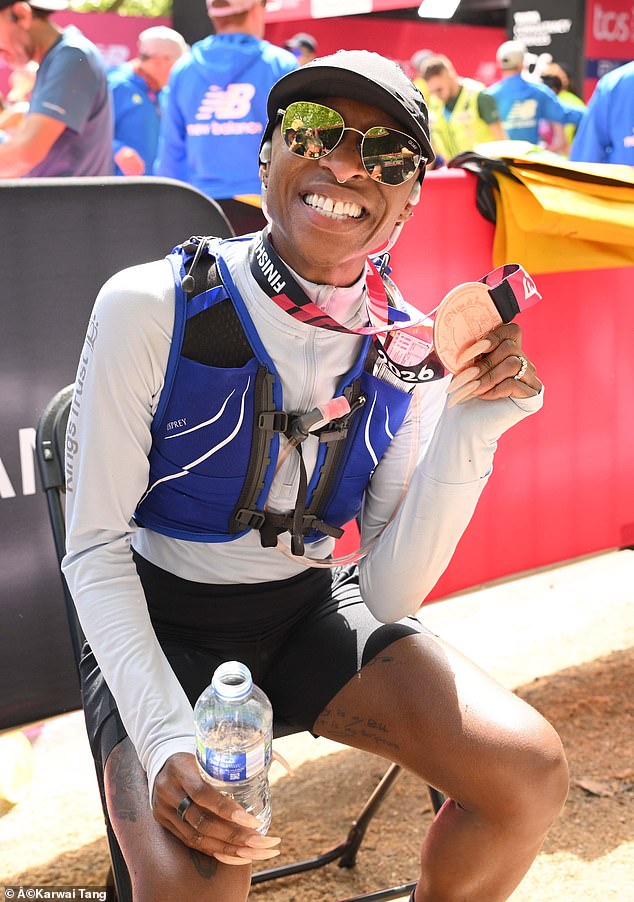 Cynthia Erivo, 39, smashed her personal best when she crossed the finish line at three hours and 21 minutes, beating her previous time of three hours and 35 minutes which she achieved in 2022.