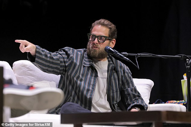 Jonah Hill, 42, spoke about his experiences working with ‘f***ing nuts’ director David O. Russell when he was 21 and making his debut in I Heart Huckabees during a live taping of the Smartless podcast on Saturday in LA (pictured)