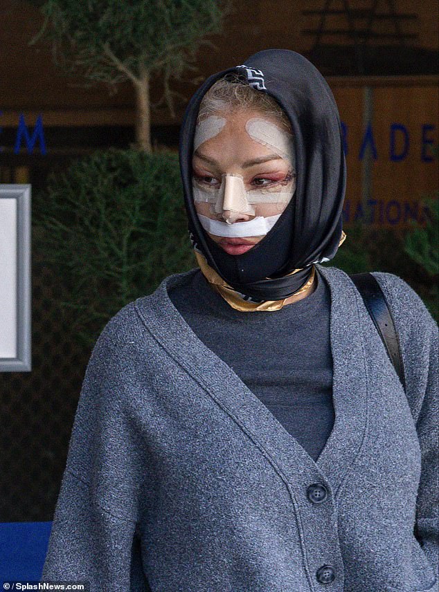 Her face was wrapped in a black support band while her nose, lips and forehead were all sealed with bandages across her bruised skin.
